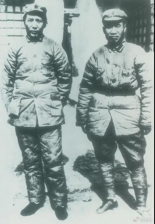 1937年7月7日,盧溝橋事變爆發。8日,中共中央通電全國,號召結成民族統一戰線抵抗日本侵略者。圖為1936年冬毛澤東和朱德在陜北。