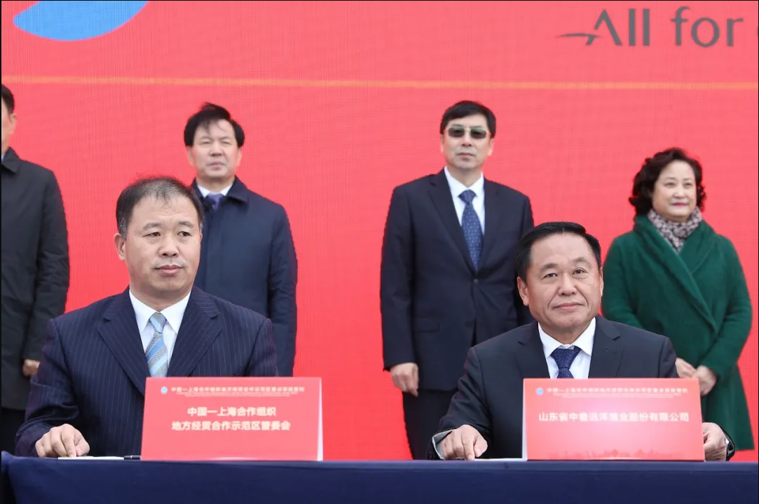 2020年11月20日,山東省中魯遠洋漁業股份有限公司(以下簡稱“中魯遠洋”)黨委書記、董事長盧連興和董事、總經理王歡一行參加了中國—上海合作組織地方經貿合作示范區(以下簡稱“上合示范區”)重點項目集中開工和簽約儀式,黨委書記、董事長盧連興代表中魯遠洋與上合示范區簽署中魯遠洋國際金槍魚創新產業園項目框架協議。青島市委常委、膠州市委書記、中國—上海合作組織地方經貿合作示范區黨工委書記、管委會主任劉建軍作了致辭,青島市相關單位負責同志、膠州市領導及簽約嘉賓出席。