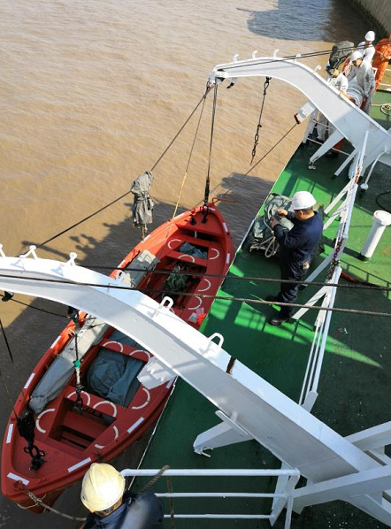 圖為岸基人員正在檢查救生艇的保養(yǎng)狀況,做好船舶備檢工作。