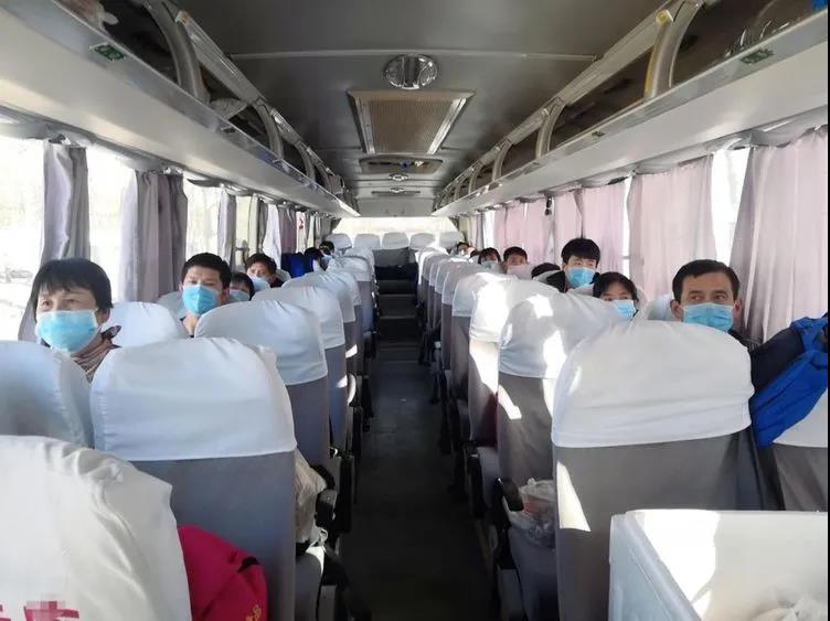 發車之前,中魯食品公司安排了六位車長隨車前行,跟車服務,并每車配備了體溫計、口罩、手套等防護用品及充足的食品;煙臺交運集團駕駛員在發車前,用消毒液對車門、扶手、座椅靠背、窗戶進行了消殺,對車內地板和壓槽用消毒液進行清洗。