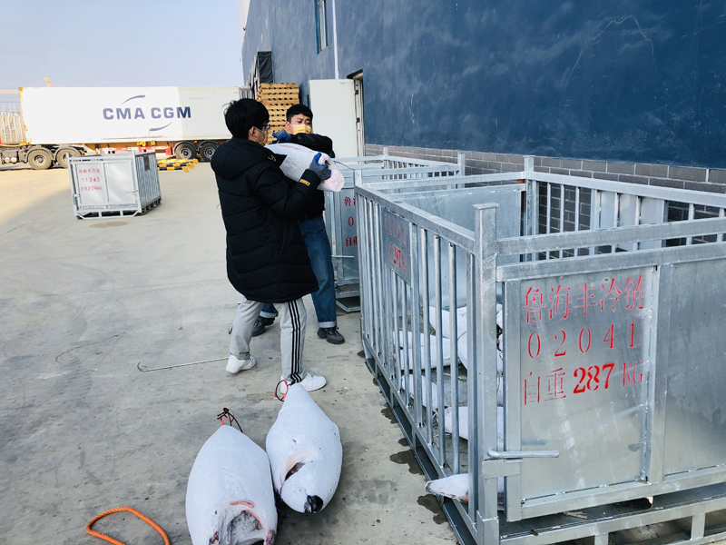 “來魚了,準備卸魚!”一聲中氣十足的吆喝打破了冷庫的寧靜,隨著滿載超低溫金槍魚魚貨的貨車進廠,卸魚人員摩拳擦掌、圍上前來,開始了新一輪的忙碌,冷庫里一派熱火朝天的工作景象。